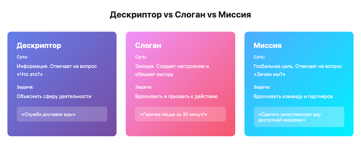 Дескриптор обычно живет в тесной связке с логотипом. Слоган может меняться от одной рекламной кампании к другой. А миссия — это полярная звезда, которая светит вашему бизнесу, но не всегда видна вашим клиентам. У каждого из этих инструментов своя работа и свое место.