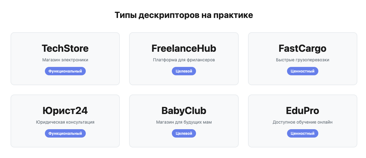 Это уже высший пилотаж. Такой дескриптор не просто называет категорию, но и намекает на ваше ключевое преимущество. «Быстрая доставка продуктов», «Надежные грузоперевозки», «Доступное обучение английскому». Здесь уже появляется элемент позиционирования.