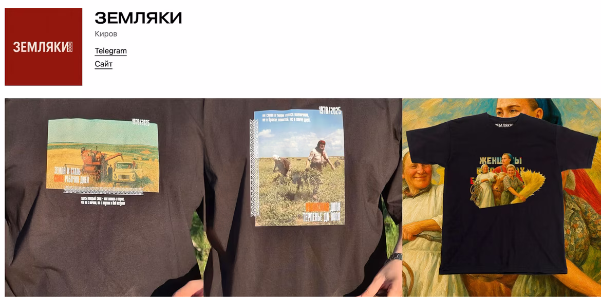 Земляки (г.Киров) — бренд одежды, рожденный в сердце русского села. Ребята пишут на сайте, что черпают вдохновение в теплом запахе свежескошенного сена, потрескивании печи и пейзажах, где небо сливается с полями. Их бренд — это дань уважения людям, чьи руки знают, как непросто достается хлеб, и чьё сердце крепко связано с родной стороной.
