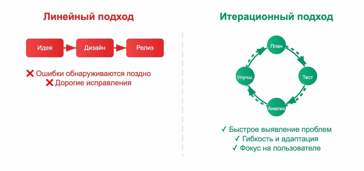 Постоянная обратная связь делает процесс разработки и дизайна ориентированным на аудиторию. Итерации превращают гипотезы в доказанные решения и помогают создавать продукт, который действительно нужен людям.