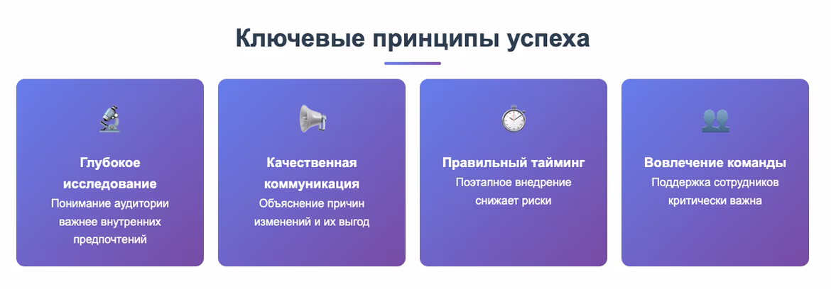 Постепенное внедрение дает аудитории время привыкнуть к изменениям. Можно начать с менее заметных элементов, постепенно переходя к основным.