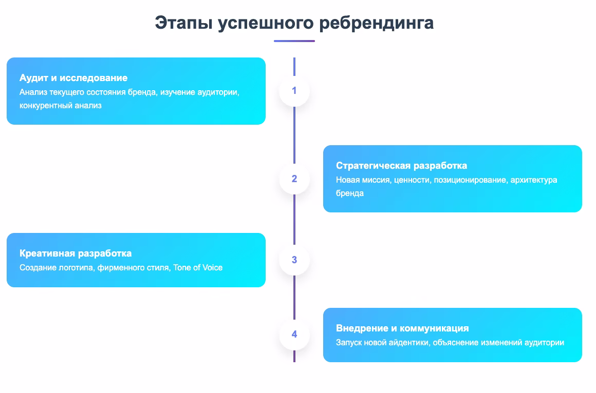 Ребрендинг — это сложный процесс, который требует системного подхода. Профессионалы выделяют четыре ключевых этапа.
