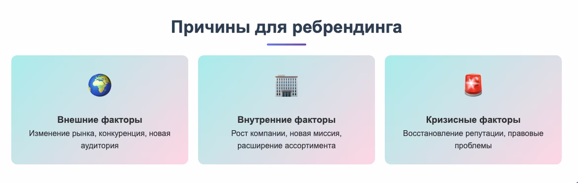 Компании решаются на ребрендинг по разным причинам. Условно их можно разделить на три группы: внешние, внутренние и кризисные факторы.