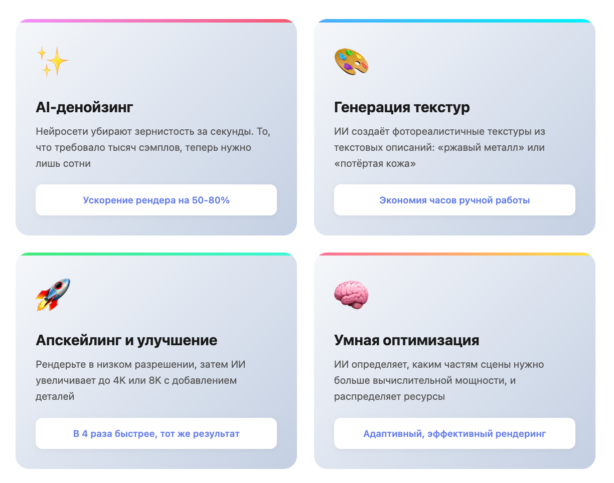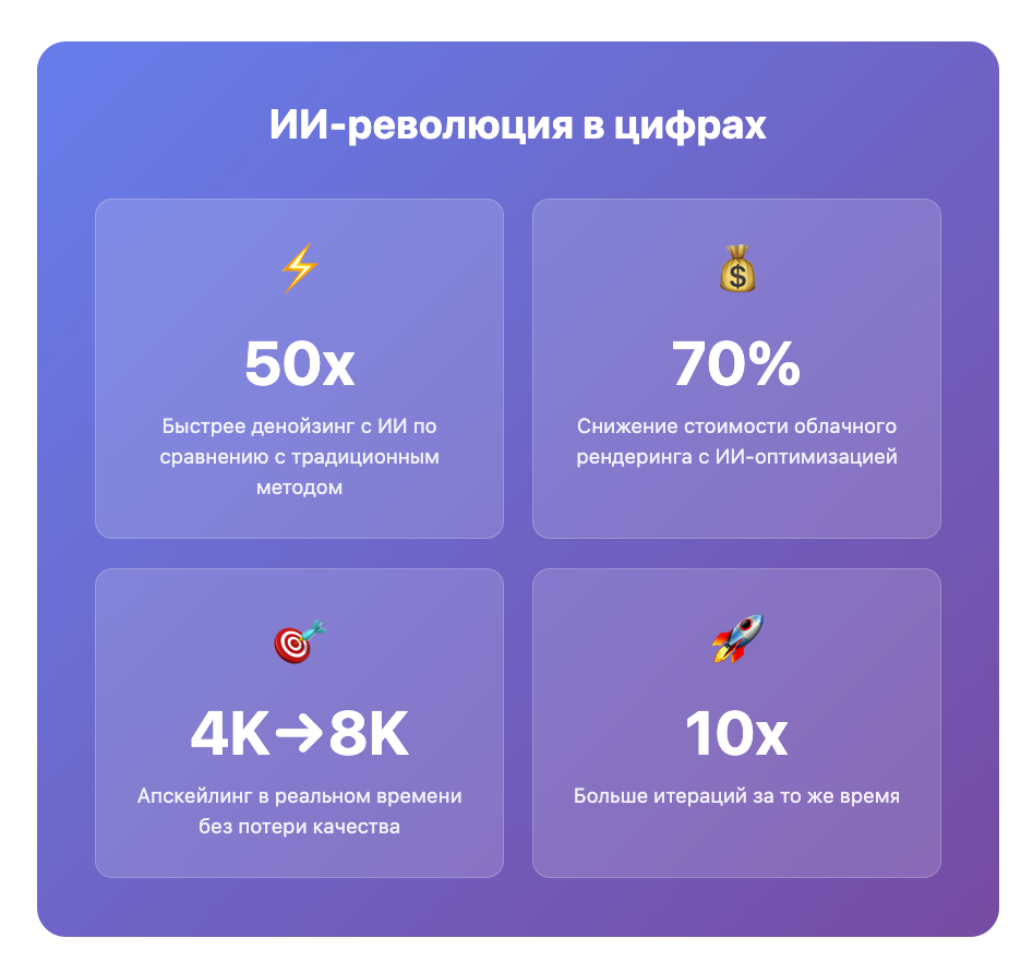 Искусственный интеллект изменил процесс рендеринга. То, что раньше занимало часы, теперь делается за минуты. Нейросети ускоряют работу и улучшают качество.