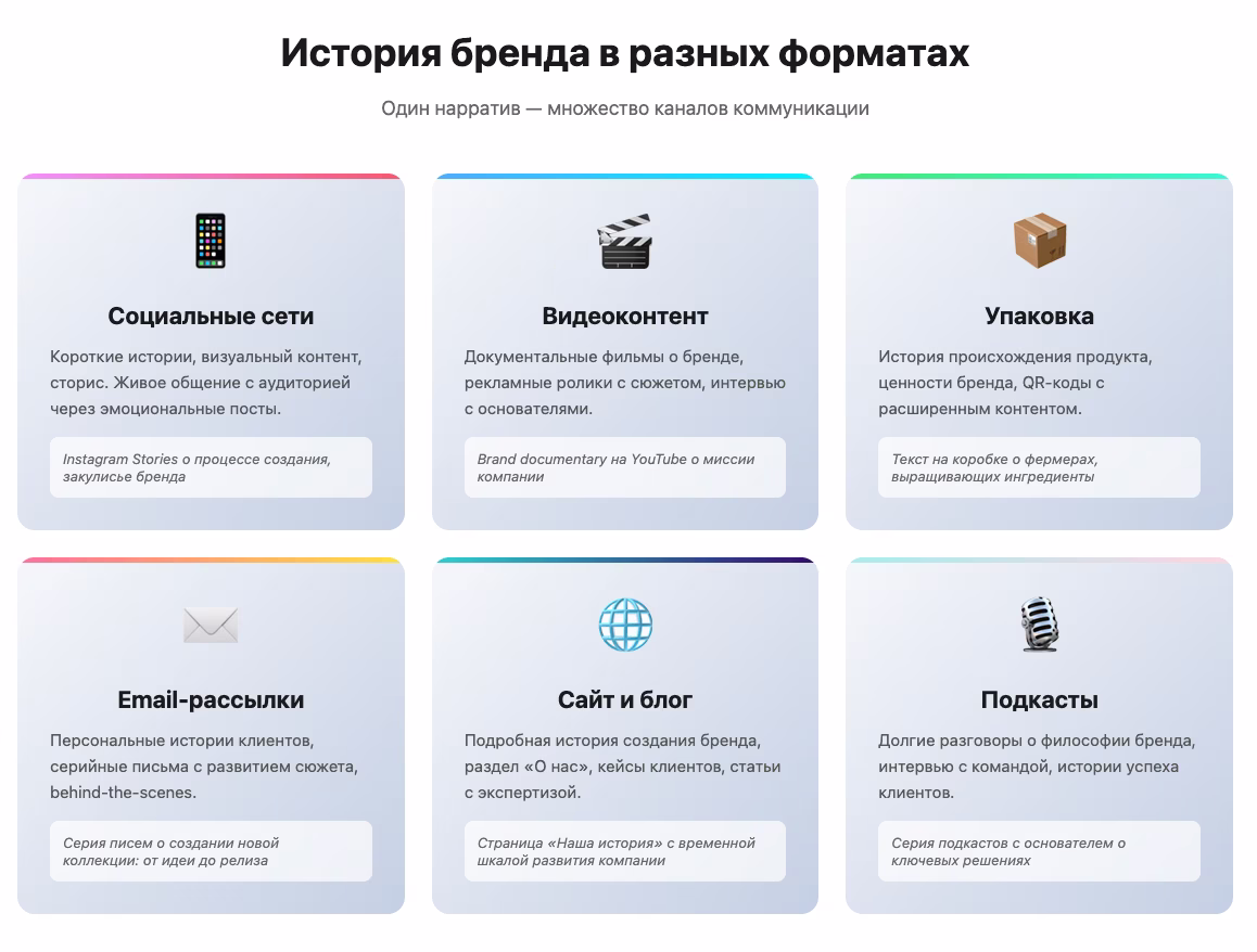 История должна проходить через все точки контакта с клиентом. Сайт, соцсети, упаковка, реклама — везде должен звучать один нарратив.