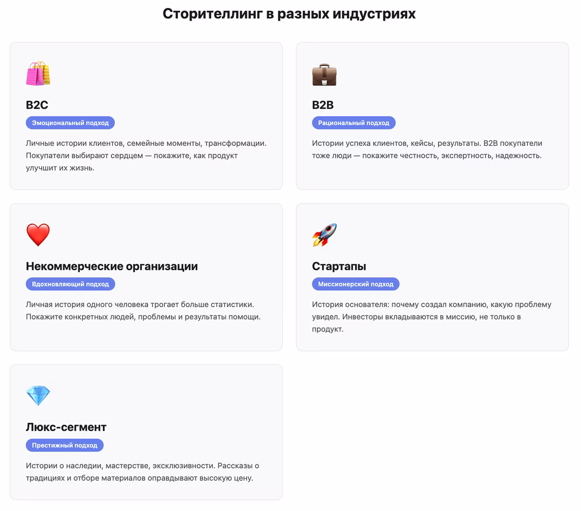 Каждая индустрия имеет свои особенности. Сторителлинг адаптируется под специфику бизнеса.