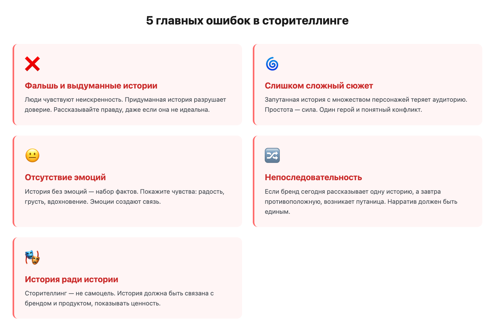 Сторителлинг — мощный инструмент, но его легко испортить. Некоторые ошибки убивают эффект и вызывают отторжение.
