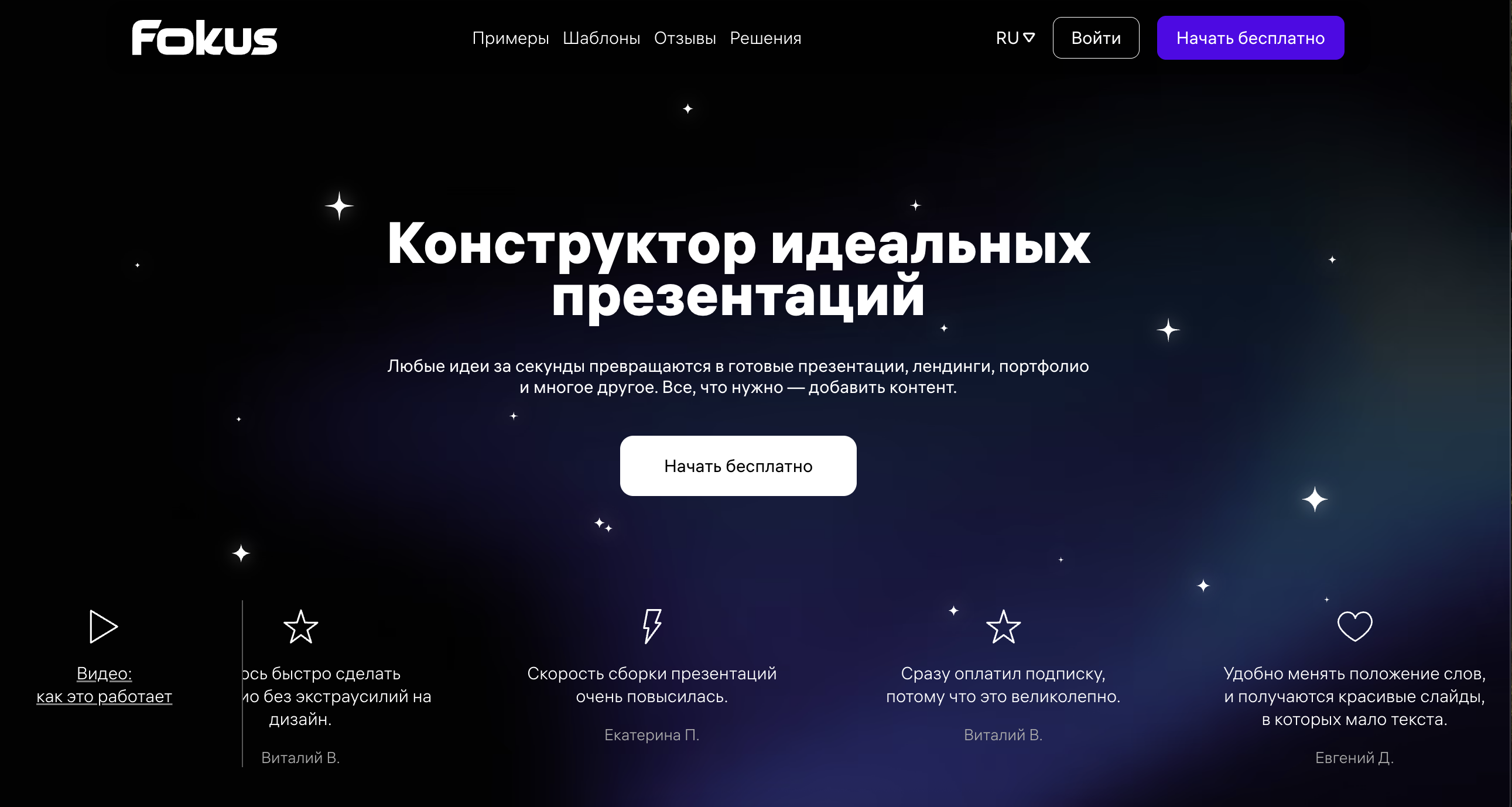 Решение: "Фокус" – конструктор презентаций на основе ИИ, разработанный в Студии Артемия Лебедева. «Фокус» автоматически создает профессиональные, продуманные и яркие слайды для любой презентации. Больше не нужно подбирать цвета, шрифты, расположение контента — все уже готово.