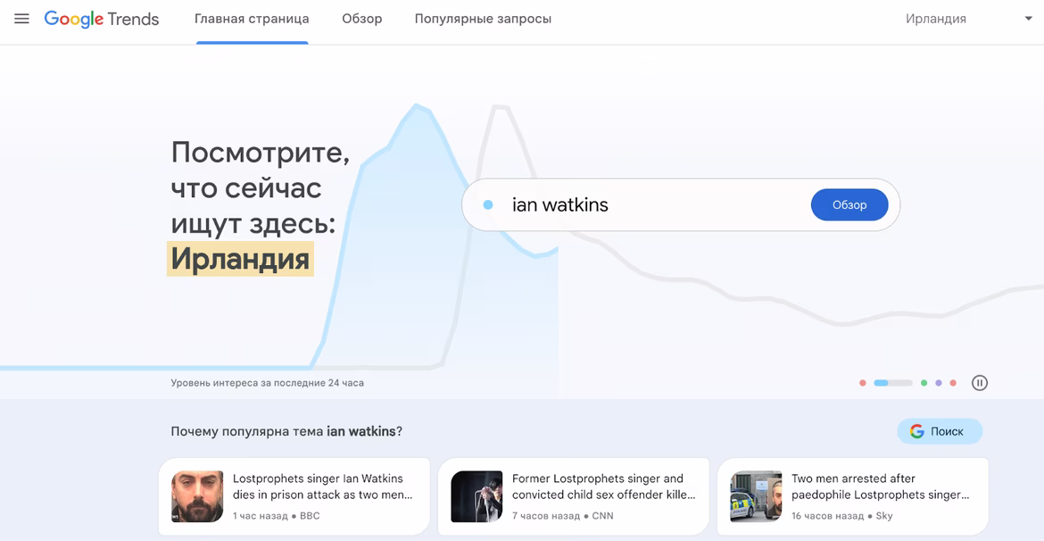 Решение: Google Trends показывает популярность поисковых запросов в реальном времени. Вы видите, какие темы растут, какие падают, где популярны темы по регионам.