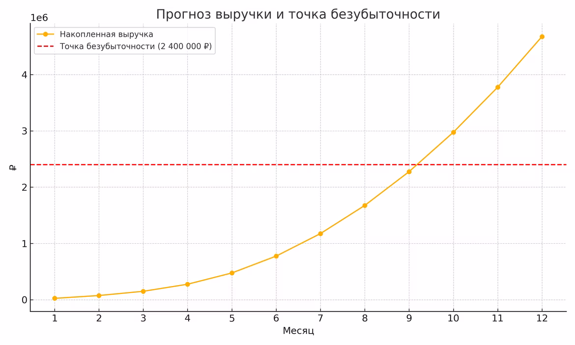 Месяц выхода в безубыточность: 8-й, когда накопленная выручка превысит стартовые затраты.