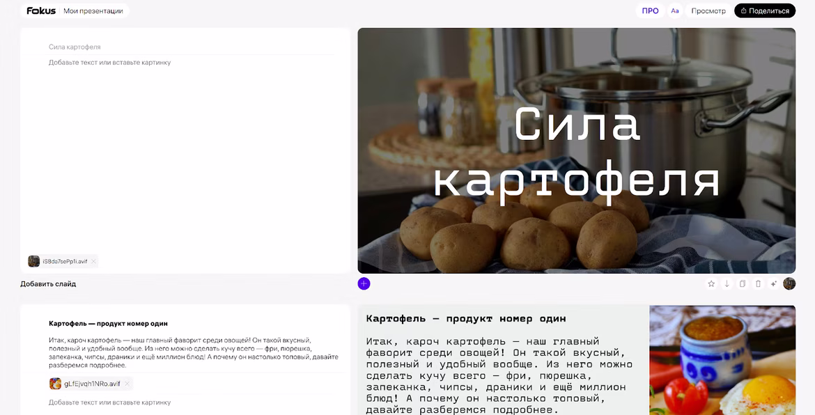 Фокус — это конструктор презентаций, который не пытается заменить автора нейронной сетью. Вместо этого он обрабатывает все визуальные элементы, оставляя семантическую составляющую человеку.
