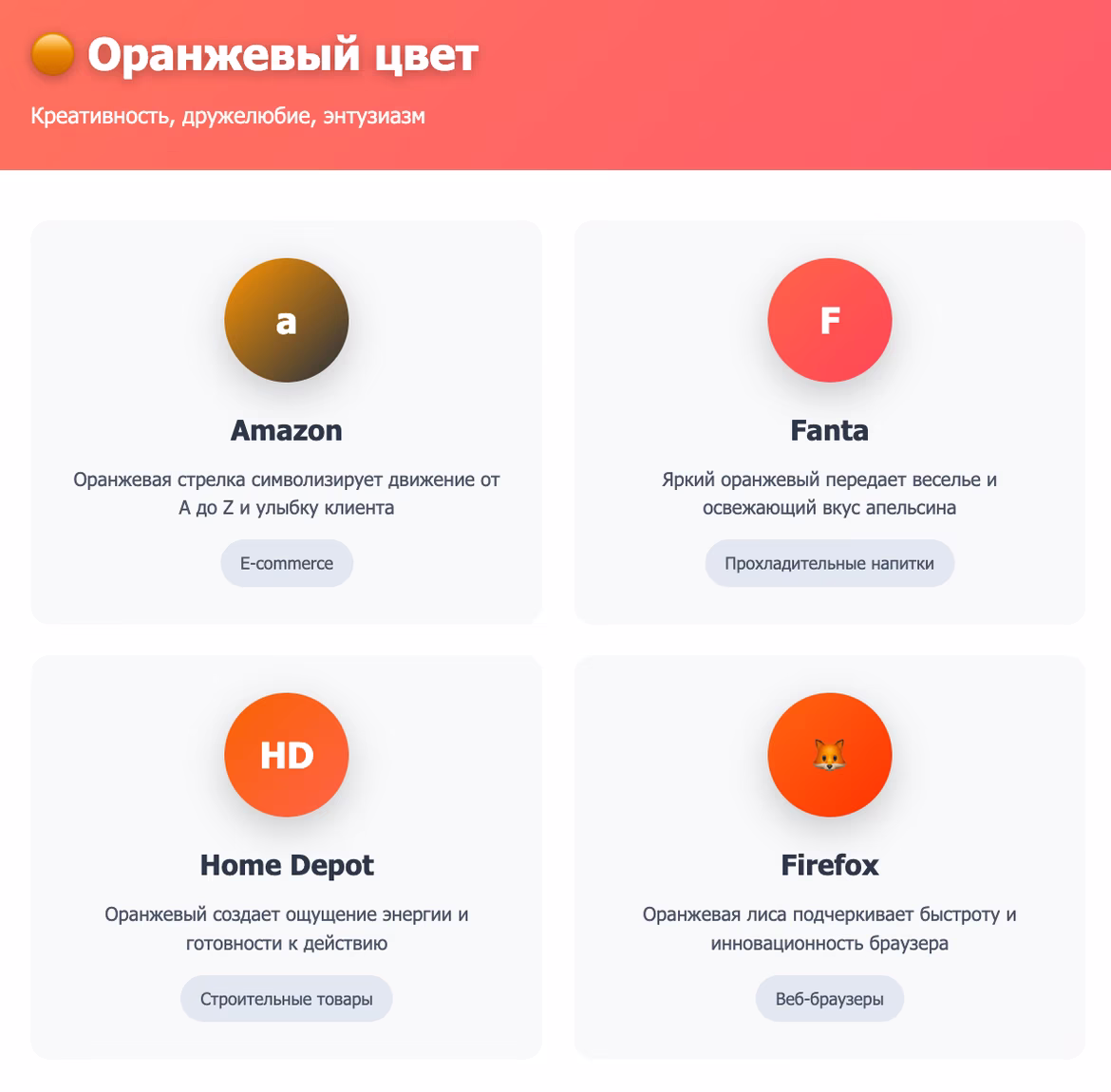Оранжевый идеально подходит для брендов в сфере развлечений, технологий, розничной торговли и креативных индустрий. Он помогает создать образ компании, которая ценит инновации и близка к своим клиентам.