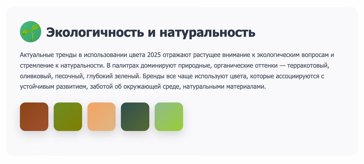 Актуальные тренды в использовании цвета 2025 отражают растущее внимание к экологическим вопросам и стремление к натуральности. В палитрах доминируют природные, органические оттенки — терракотовый, оливковый, песочный, глубокий зеленый.